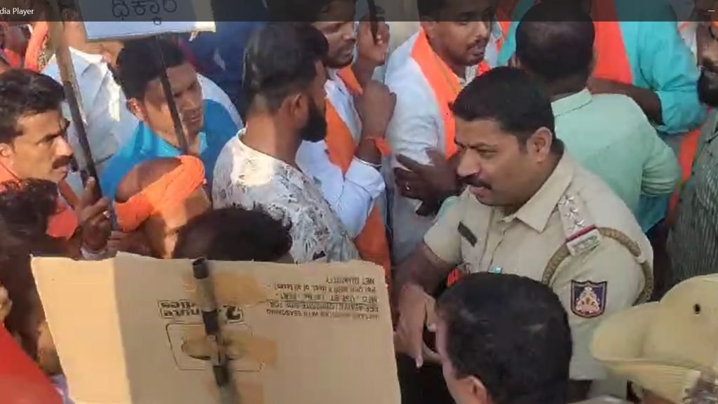 ರಾಜ್ಯಾದ್ಯಂತ ಹಿಂದೂ ವಿರೋಧಿ ಕೃತ್ಯದ ಆರೋಪ- ಭಯೋತ್ಪಾದನಾ ವಿರೋಧಿ ಹೋರಾಟ ಸಮಿತಿಯಿಂದ ಪ್ರತಿಭಟನೆ-ಪೊಲೀಸರು ಮತ್ತು ಕಾರ್ಯಕರ್ತರ ನಡುವೆ ಮಾತಿನ ಚಕಮಕಿ