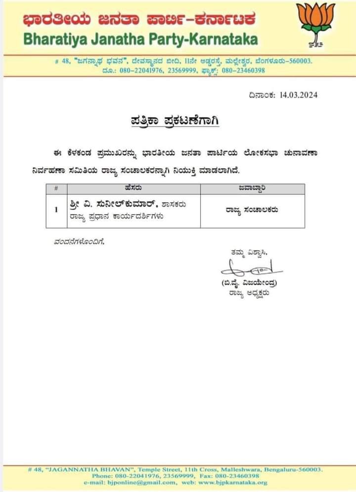 ಲೋಕಸಭೆ ಚುನಾವಣೆ ನಿರ್ವಹಣಾ ಸಮಿತಿ ರಾಜ್ಯ ಸಂಚಾಲಕರನ್ನಾಗಿ ಪ್ರಧಾನ ಕಾರ್ಯದರ್ಶಿ ವಿ. ಸುನಿಲ್ ಕುಮಾರ್ ಅವರನ್ನು ಬಿಜೆಪಿ ರಾಜ್ಯಾಧ್ಯಕ್ಷ ಬಿ. ವಿಜಯೇಂದ್ರ ನೇಮಿಸಿ ಗುರುವಾರ ಆದೇಶಿಸಿದ್ದಾರೆ.
