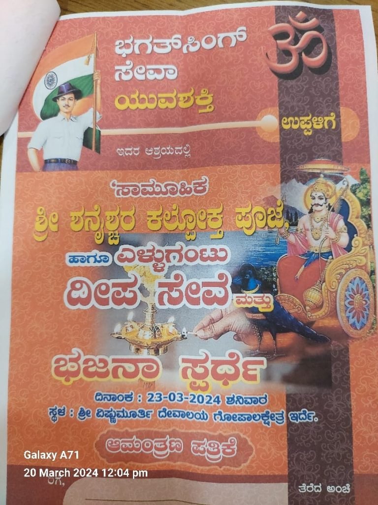 ಚುನಾವಣಾ ನೀತಿ ಸಂಹಿತೆ ಜಾರಿ ಹಿನ್ನೆಲೆಯಲ್ಲಿ ಭಗತ್ ಸಿಂಗ್ ಸೇವಾ ಯುವಶಕ್ತಿ ಸಂಘದ ಧಾರ್ಮಿಕ ಕಾರ್ಯಕ್ರಮ ಆಮಂತ್ರಣ ಪತ್ರಿಕೆಯಲ್ಲಿ ಭಗತ್ ಸಿಂಗ್ ಫೋಟೋ ಹಾಕಿರುವ ಬಗ್ಗೆ ಮಾಹಿತಿ ತಿಳಿದ ಪುತ್ತೂರು ಸಹಾಯಕ ಆಯುಕ್ತರಿಂದ ಪರಿಶೀಲನೆ ನಡೆಸಲಾಯಿತು.