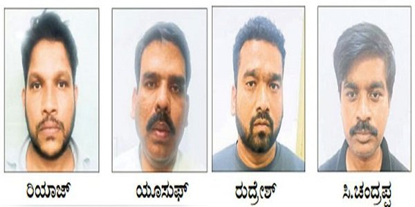 ಬೆಂಗಳೂರಿನ ತಾವರೆಕೆರೆ ನಿವಾಸಿ ರಿಯಾಜ್ ಅಹ್ಮದ್ (41), ಮಲ್ಲೇಶ್ವರದ ನಿವಾಸಿ ಯೂಸುಫ್ ಸುಬ್ಬೆಕಟ್ಟೆ (47), ರಾಮನಗರ ಜಿಲ್ಲೆ ಕನಕಪುರ ತಾಲೂಕಿನ ರುದ್ರೇಶ್ (35) ಮತ್ತು ಚಿಕ್ಕಮಗಳೂರು ಕಳಸ ತಾಲೂಕಿನ ತೋಟಗಾರಿಕಾ ನಿರ್ದೇಶಕರ ಕಚೇರಿ ಸಿಬ್ಬಂದಿ ಸಿ.ಚಂದ್ರಪ್ಪ (44) ಎಂಬುವರನ್ನು ಬಂಧಿಸಲಾಗಿದೆ.