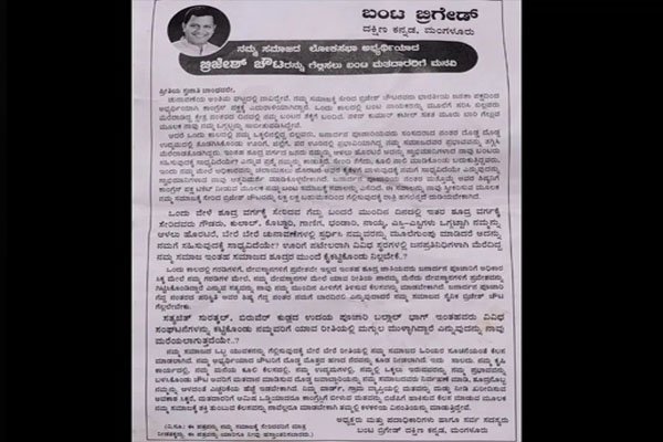 ದಕ್ಷಿಣ ಕನ್ನಡ ಲೋಕಸಭೆ ಕ್ಷೇತ್ರದ ಬಿಜೆಪಿ ಅಭ್ಯರ್ಥಿ ಕ್ಯಾ. ಬ್ರಿಜೇಶ್ ಚೌಟರ ಬಗ್ಗೆ ಯಾವುದೇ ಅಸ್ತಿತ್ವವಿಲ್ಲದ ‘ಬಂಟರ ಬ್ರಿಗೇಡ್’ ಎನ್ನುವ ಸಂಘಟನೆ ರಪತ್ರ ಮುದ್ರಿಸಿ, ಆಕ್ಷೇಪಾರ್ಹ ವಿಚಾರಗಳನ್ನು ಬರೆದು ಜಾತಿಗಳ ನಡುವೆ ದ್ವೇಷ ಹಬ್ಬಿಸುವ ಯತ್ನ ನಡೆದಿದ್ದು, ಬಿಜೆಪಿ ಕಾನೂನು ಪ್ರಕೋಷ್ಠ ಜಿಲ್ಲಾ ಚುನಾವಣಾಧಿಕಾರಿಗೆ ದೂರು ಸಲ್ಲಿಸಿದೆ. ಕರಪತ್ರದಲ್ಲಿ ಬ್ರಿಜೇಶ್ ಚೌಟರ ಭಾವಚಿತ್ರ ಬಳಸಿ ಆಕ್ಷೇಪಾರ್ಹ ವಿಚಾರಗಳನ್ನು ಮುದ್ರಿಸಿ, ಕರಪತ್ರವನ್ನು ಜಾಲತಾಣದಲ್ಲಿ ಹರಿಯ ಬಿಟ್ಟಿದ್ದಾರೆ. ಜಾತಿಗಳ ನಡುವೆ ದ್ವೇಷ ಬಿತ್ತಿ ಅದರ ದುರ್ಲಾಭವನ್ನು ಕಾಂಗ್ರೇಸ್ ಪಕ್ಷ ಪಡೆಯುತ್ತಿದೆ. ಈ ಬಗ್ಗೆ ಕಠಿಣ ಕ್ರಮ ಕೈಗೊಳ್ಳಬೇಕೆಂದು ಜಿಲ್ಲಾ ಕಾನೂನು ಪ್ರಕೋಷ್ಠದ ಜಿಲ್ಲಾ ಸಹ ಸಂಚಾಲಕ ದೇವಿಪ್ರಸಾದ್ ಸಾಮಾನಿ ಒತ್ತಾಯಿಸಿದ್ದಾರೆ.