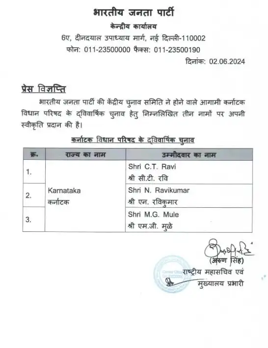 ಮಾಜಿ ಸಚಿವ ಸಿ.ಟಿ.ರವಿ, ಪರಿಷತ್ತಿನಲ್ಲಿ ವಿರೋಧ ಮುಖ್ಯಸಚೇತಕರಾಗಿರುವ ಎನ್.ರವಿಕುಮಾರ್ ಹಾಗೂ ಮರಾಠ ಅಭಿವೃದ್ಧಿ ನಿಗಮದ ಮಾಜಿ ಅಧ್ಯಕ್ಷ ಎಂ.ಜಿ.ಮುಳೆ ಯನ್ನು ಅಭ್ಯರ್ಥಿಗಳನ್ನಾಗಿ ಬಿಜೆಪಿ ಘೊಷಿಸಿದೆ