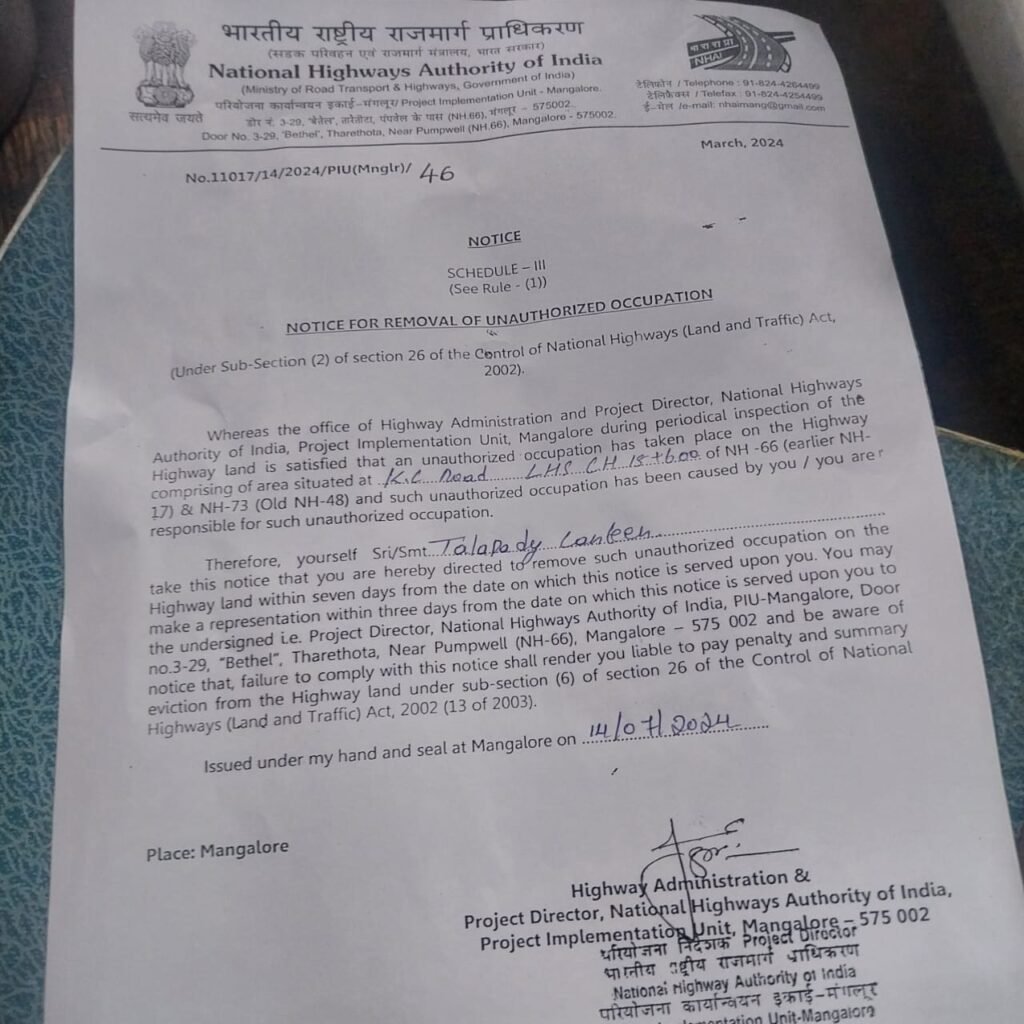 ಕುಂದಾಪುರದಿಂದ ತಲಪಾಡಿವರೆಗಿನ ರಸ್ತೆಬದಿ ಅಂಗಡಿಗಳೆಲ್ಲವನ್ನೂ ತೆರವುಗೊಳಿಸಲಾಗುವುದು. ನೋಟೀಸ್ ಎರಡು ಬಾರಿ ನೀಡಲಾಗಿದೆ, ಇಂದು ತೆರವು