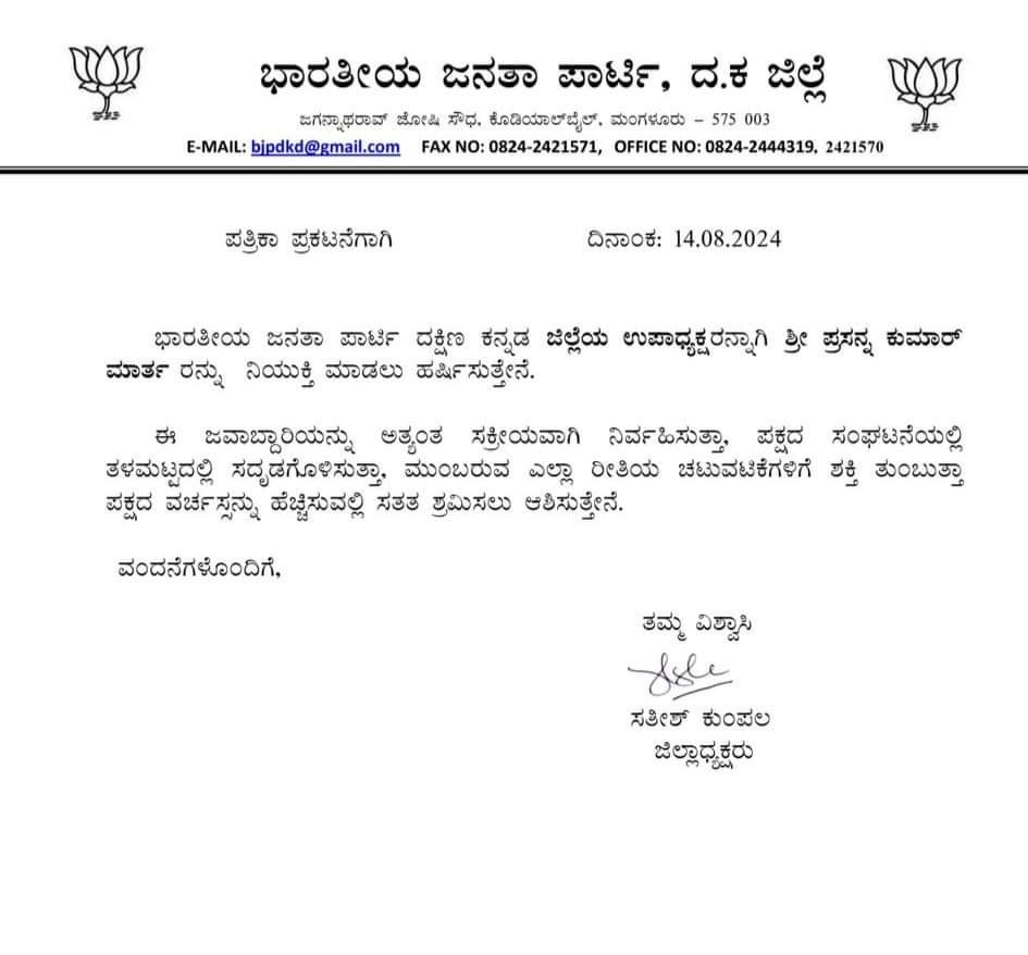 ಬಿಜೆಪಿ ಜಿಲ್ಲಾ ಉಪಾಧ್ಯಕ್ಷರಾಗಿ ಪ್ರಸನ್ನಕುಮಾರ್ ಮಾರ್ತ ಅವರನ್ನು ನಿಯುಕ್ತಿಗೊಳಿಸಲಾಗಿದೆ. ಪ್ರಸನ್ನಕುಮಾರ್ ಮಾರ್ತ ಅವರು ಪುತ್ತಿಲ ಪರಿವಾರ ಸೇವಾ ಟ್ರಸ್ಟ್ ಅಧ್ಯಕ್ಷರಾಗಿದ್ದರು.