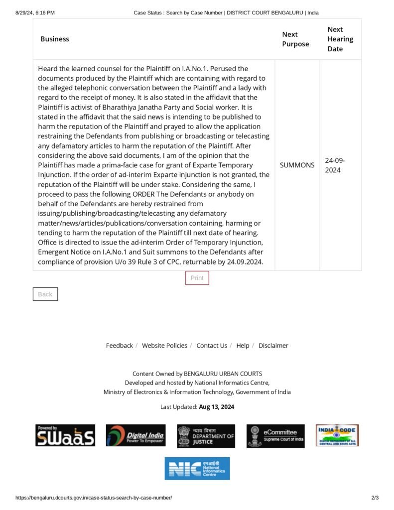 ಅವರ ಮಾನಹಾನಿ ಆಗುವಂತಹ ಯಾವುದೇ ಸುದ್ದಿ ಅಥವಾ ವರದಿಗಳನ್ನು ಮುದ್ರಣ ಹಾಗೂ ವಿದ್ಯುನ್ಮಾನ ಮಾಧ್ಯಮಗಳು ಮತ್ತು ಸಾಮಾಜಿಕ ಮಾಧ್ಯಮಗಳು ಪ್ರಕಟಿಸುವುದಾಗಲೀ ಅಥವಾ ಬಿತ್ತರಿಸುವುದಾಗಲೀ ಮಾಡಬಾರದು’ ಎಂದು ಬೆಂಗಳೂರಿನ ಸಿಟಿ ಮತ್ತು ಸಿವಿಲ್ ಸೆಷನ್ಸ್ ನ್ಯಾಯಾಲಯ ತಾತ್ಕಾಲಿಕ ಆದೇಶ ಹೊರಡಿಸಿದ್ದಾರೆ.