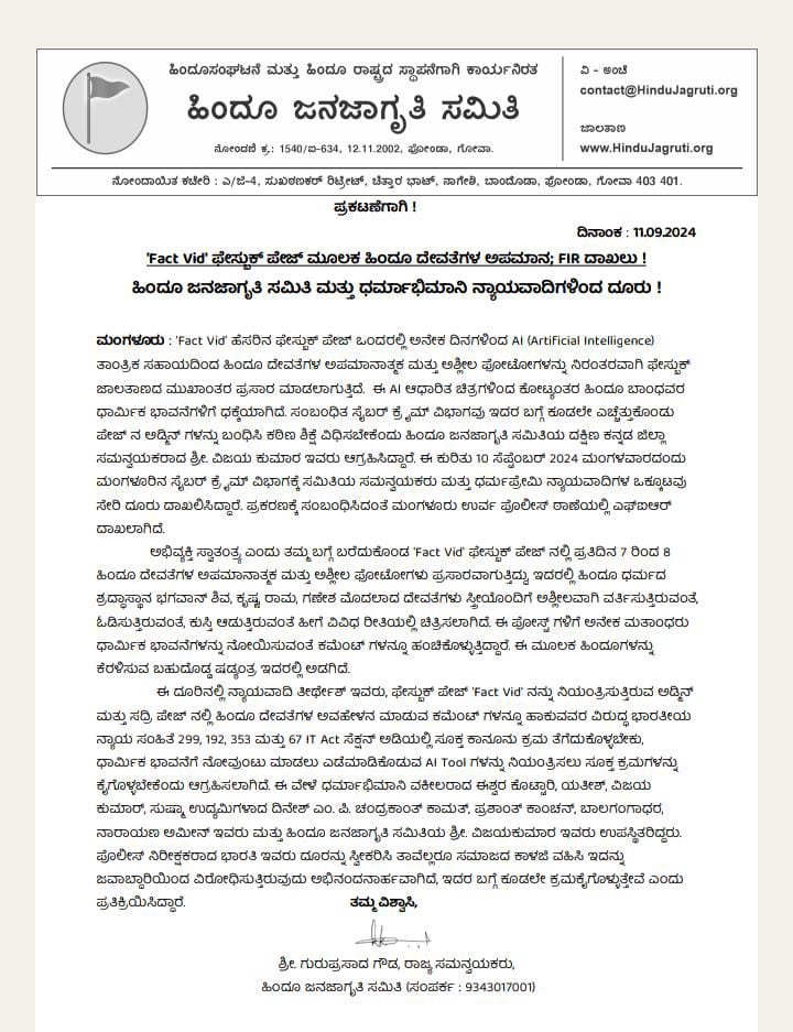 Fact Vid’ ಫೇಸ್ಬುಕ್ ಪೇಜ್ ಮೂಲಕ ಹಿಂದೂ ದೇವತೆಗಳ ಅಪಮಾನ FIR ದಾಖಲು