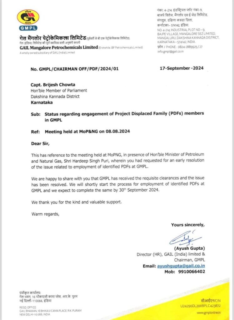 ಕ್ಯಾ. ಚೌಟ ಅವರು, ತಮ್ಮ ಚೊಚ್ಚಲ ಅಧಿವೇಶನದ ವೇಳೆಯೇ ಅಂದರೆ ಕಳೆದ ಜೂನ್ 26ರಂದು ಕೇಂದ್ರ ಸಚಿವ ಹರ್ದೀಪ್ ಸಿಂಗ್ ಪುರಿ ಅವರನ್ನು ಭೇಟಿಯಾಗಿ ಮನವಿ ಸಲ್ಲಿಸಿದ್ದರು. ಈ ಪತ್ರದಲ್ಲಿ ಕ್ಯಾ. ಚೌಟ ಅವರು, ಭೂಮಿಯನ್ನು ಸ್ವಾಧೀನ ಪಡಿಸಿಕೊಂಡಿದ್ದಾಗ ಜೆಬಿಎಫ್‌ಪಿಎಲ್‌ ಭೂಮಿ ಕಳೆದುಕೊಂಡವರಿಗೆ  ಪೂರ್ಣಾವಧಿ ಉದ್ಯೋಗದ ಭರವಸೆ ನೀಡಿತ್ತು. ಹೀಗಾಗಿ, ಸಚಿವರು ಮಧ್ಯಪ್ರವೇಶಿಸಿ ಪಿಡಿಎಫ್‌ ಆಧಾರಿತ ಪೂರ್ಣಾವಧಿ ಉದ್ಯೋಗವನ್ನು ಜಿಎಂಪಿಎಲ್‌ನಲ್ಲಿ ಒದಗಿಸುವಂತೆ ಮನವಿ ಮಾಡಿದ್ದರು. ಚೌಟ ಅವರ ಈ ಮನವಿ ಬೆನ್ನಲ್ಲೇ ಆ.7ರಂದು ಸಚಿವ ಹರ್ದೀಪ್‌ ಸಿಂಗ್‌ ಪುರಿ ಅವರು ಸಂಬಂಧಪಟ್ಟ ಇಲಾಖಾಧಿಕಾರಿಗಳ ಮಹತ್ವದ ಸಭೆ ನಡೆಸಿದ್ದರು. ಆ ಮೂಲಕ ಕೇವಲ 40 ದಿನದೊಳಗೆ ಈ ಗಂಭೀರ ಸಮಸ್ಯೆಯನ್ನು ಕೇಂದ್ರ ಸರ್ಕಾರದ ಪೆಟ್ರೋಲಿಯಂ ಸಚಿವಾಲಯ ಬಗೆಹರಿಸಿದೆ ಎಂದು ಕ್ಯಾ. ಚೌಟ ಅವರು ಸಂತಸ ವ್ಯಕ್ತಪಡಿಸಿದ್ದಾರೆ
