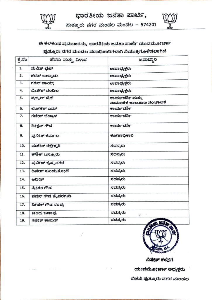 ಪುತ್ತೂರು ನಗರ ಮಂಡಲ ಬಿಜೆಪಿ ಯುವಮೋರ್ಛಕ್ಕೆ ಪದಾಧಿಕಾರಿಗಳ ನಿಯುಕ್ತಿ