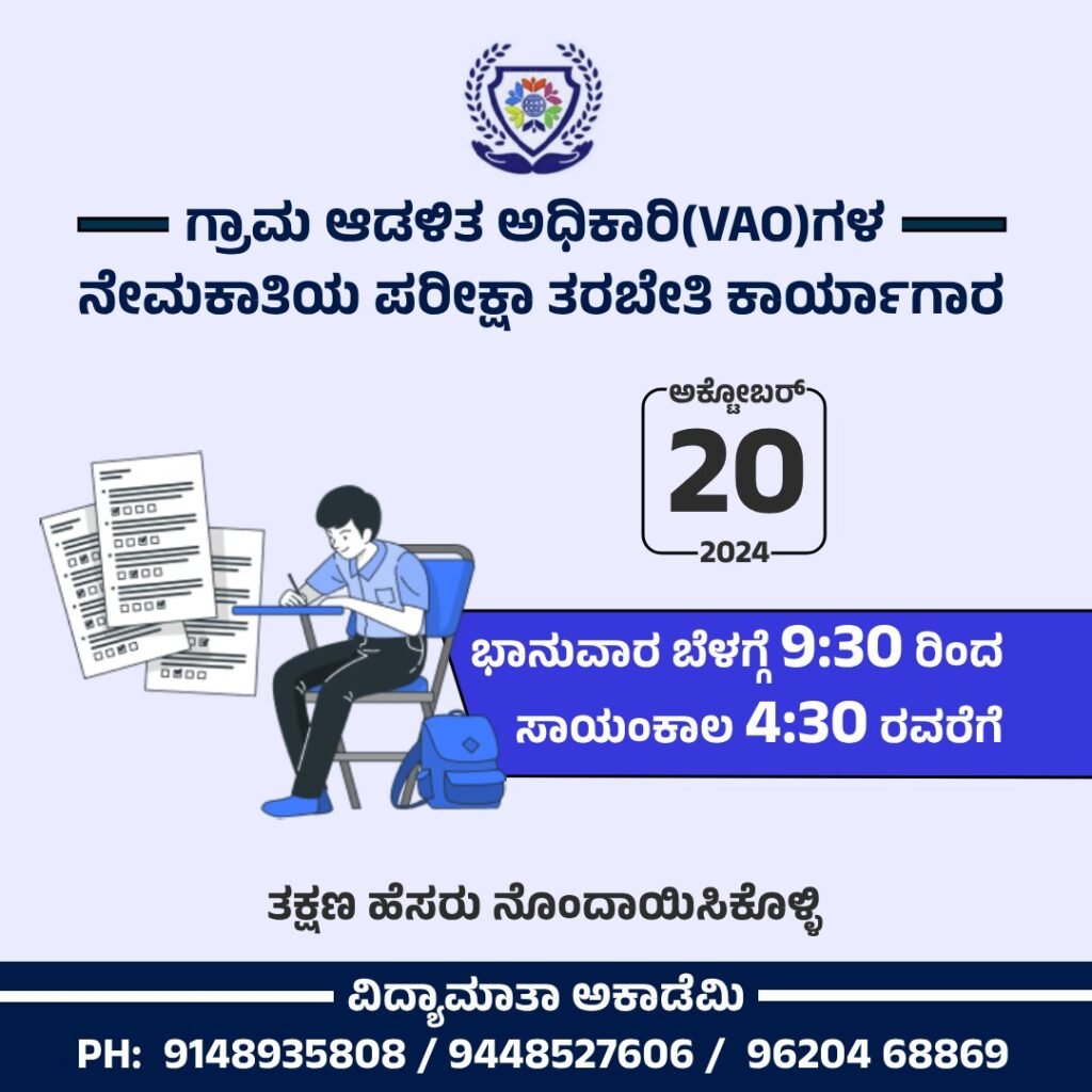 ಗ್ರಾಮ ಆಡಳಿತ ಅಧಿಕಾರಿ ಹುದ್ದೆಯ ನೇಮಕಾತಿ ಪರೀಕ್ಷೆ ಹಾಗೂ ಎರಡನೇ ಹಂತದ ಕಡ್ಡಾಯ ಕನ್ನಡ ಪರೀಕ್ಷೆಗೆ ತರಬೇತಿ ಪ್ರಾರಂಬಿಸಿದ ವಿದ್ಯಾಮಾತಾ ಅಕಾಡೆಮಿ