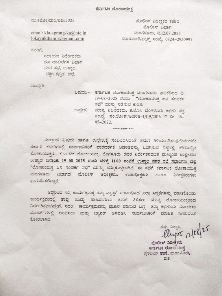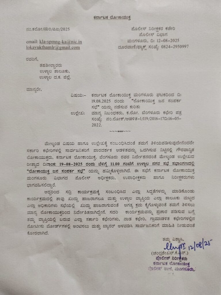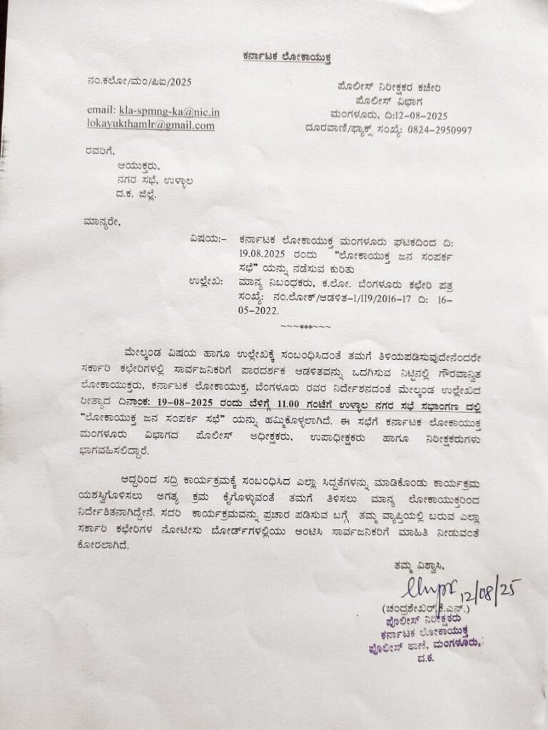 ದಿನಾಂಕ: 19-08-2025 ರಂದು ಬೆಳಿಗ್ಗೆ 11-00 ಗಂಟೆಯಿಂದ ಉಳ್ಳಾಲ ನಗರ ಸಭೆ ಕಛೇರಿಯ ಸಭಾಂಗಣ, ಉಳ್ಳಾಲ ತಾಲೂಕು ಇಲ್ಲಿ “ಲೋಕಾಯುಕ್ತ ಜನ ಸಂಪರ್ಕ ಸಭೆ” ಯನ್ನು ಆಯೋಜಿಸಲಾಗಿರುತ್ತದೆ .