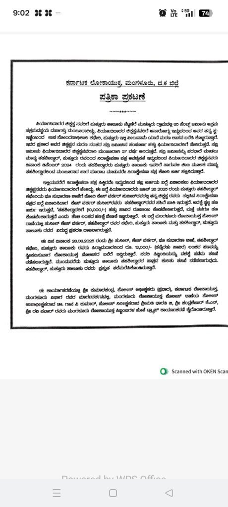 ಇಲ್ಲಿಯವರೆಗೆ ನಿರಾಕ್ಷೇಪಣಾ ಪತ್ರ ಸಿಕ್ಕಿರದೇ ಇದ್ದುದರಿಂದ ಸದ್ರಿ ಅರ್ಜಿಯ ಬಗ್ಗೆ ವಿಚಾರಿಸಲು ಫಿರ್ಯಾದಿದಾರರ ಚಿಕ್ಕಪ್ಪನವರು ಫಿರ್ಯಾದಿದಾರರಿಗೆ ಹೇಳಿದ್ದು, ಈ ಬಗ್ಗೆ ಪಿರ್ಯಾದಿದಾರರು ಜೂನ್ 26 2025 ರಂದು ಪುತ್ತೂರು ತಹಶೀಲ್ದಾರ್ ಕಛೇರಿಯ ಭೂ ಸುಧಾರಣಾ ಶಾಖೆಗೆ ಹೋಗಿ ಕೇಸ್ ವರ್ಕರ್ ಸುನೀಲ್ರವರಲ್ಲಿ ತನ್ನ ಚಿಕ್ಕಪ್ಪ ರವರು ಸಲ್ಲಿಸಿದ ನಿರಾಕ್ಷೇಪಣಾ ಪತ್ರದ ಬಗ್ಗೆ ವಿಚಾರಿಸಿದಾಗ ಕೇಸ್ ವರ್ಕರ್ ಸುನೀಲ್ರವರು ತಹಶೀಲ್ದಾರ್ರವರ ಸಹಿಗೆ ಬಾಕಿ ಇರುತ್ತದೆ. ಅದಕ್ಕೆ ಸ್ವಲ್ಪ ಹಣ ಖರ್ಚು ಇರುತ್ತದೆ, ‘ತಹಶೀಲ್ದಾರರಿಗೆ (10,000/-) ಹತ್ತು ಸಾವಿರ ರೂಪಾಯಿ ಕೊಡಬೇಕಾಗುತ್ತದೆ. ಮತ್ತೆ ನನಗೂ ಹಣ ಕೊಡಬೇಕಾಗುತ್ತದೆ ಎಂದು ಹೇಳಿ ಲಂಚದ ಹಣಕ್ಕೆ ಬೇಡಿಕೆ ಇಟ್ಟಿರುತ್ತಾರೆ. ಈ ಬಗ್ಗೆ ಮಂಗಳೂರು ಲೋಕಾಯುಕ್ತ ಪೊಲೀಸ್ ಠಾಣೆಯಲ್ಲಿ ಸುನೀಲ್ ಕೇಸ್ ವರ್ಕರ್, ತಹಶೀಲ್ದಾರ್ ರವರ ಕಛೇರಿ, ಪುತ್ತೂರು ತಾಲೂಕು ಮತ್ತು ತಹಶೀಲ್ದಾರ್, ಪುತ್ತೂರು ತಾಲೂಕು ರವರ ವಿರುದ್ಧ ಪ್ರಕರಣ ದಾಖಲಾಗಿರುತ್ತದೆ.