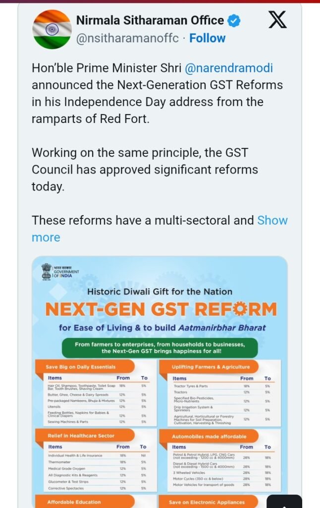 ಕೇಂದ್ರ ಮತ್ತು ರಾಜ್ಯಗಳನ್ನು ಒಳಗೊಂಡ ಜಿಎಸ್ಟಿ ಮಂಡಳಿಯು ನವರಾತ್ರಿಯ ಮೊದಲ ದಿನವಾದ ಸೆಪ್ಟಂಬರ್ 22 ರಿಂದ ಸರಕು ಮತ್ತು ಸೇವೆಗಳ ಮೇಲಿನ ತೆರಿಗೆ ದರಗಳನ್ನು ಕಡಿಮೆ ಮಾಡಲು ನಿರ್ಧರಿಸಿದೆ. ಇದು ಗ್ರಾಹಕರಿಗೆ ವರದಾನವಾಗಿದೆ.