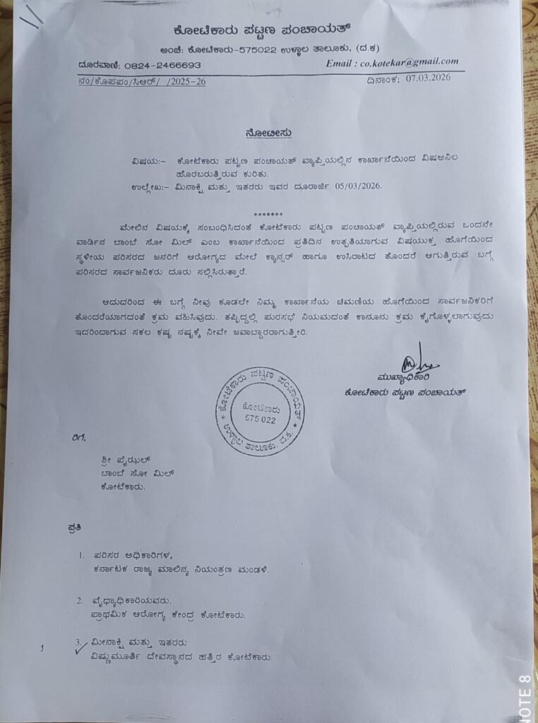 ಕೋಟೆಕಾರು: ಕೋಟೆಕಾರು ಪ್ರದೇಶದಲ್ಲಿರುವ Bombay Saw Mill ಕಾರ್ಖಾನೆಯಿಂದ ಹೊರಬರುತ್ತಿರುವ ದಟ್ಟ ಹೊಗೆ ಬಗ್ಗೆ ಸ್ಥಳೀಯರು ತೀವ್ರ ಆತಂಕ ವ್ಯಕ್ತಪಡಿಸಿದ್ದಾರೆ. ಕಾರ್ಖಾನೆಯ **ಮಾಲಿನ್ಯ ಉಗುಳುವ ಗೋಪುರ (ಧೂಮ ವಿಸರ್ಜನಾ ಘಟಕ)**ದಿಂದ ನಿರಂತರವಾಗಿ ಹೊರಸೂಸುವ ಹೊಗೆ ಸುತ್ತಮುತ್ತಲಿನ ವಾಸಸ್ಥಳಗಳನ್ನು ಆವರಿಸಿಕೊಂಡು, ಜನರ ಆರೋಗ್ಯದ ಮೇಲೆ ಹಾನಿಕಾರಕ ಪರಿಣಾಮ ಬೀರುತ್ತಿದೆ.
